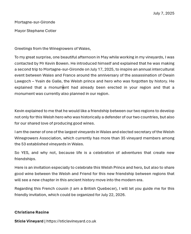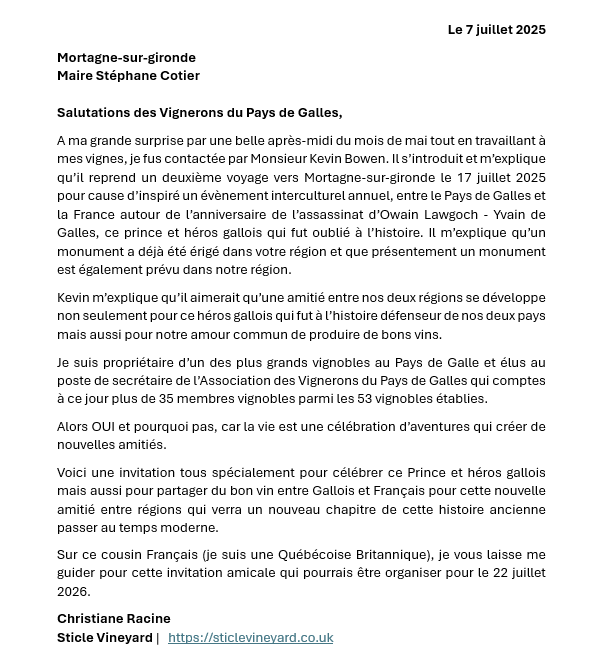 With the help from local businesses here in Wales, we are helping to build roots and share the history of our two great countries and towns. In the video below we see the mayor of Mortagne-sur-Gironde reading a letter from Christiane Racine, the owner of a Welsh vineyard: Sticle Vineyard offering for him to come over to Wales and celebrate Owain Lawgoch and strengthen the bonds between our two regions.